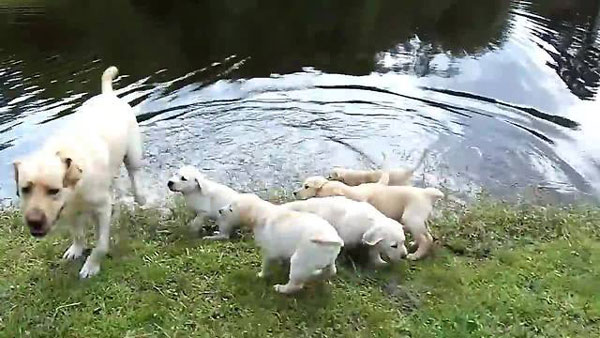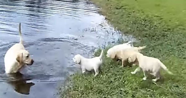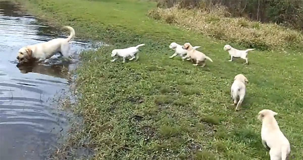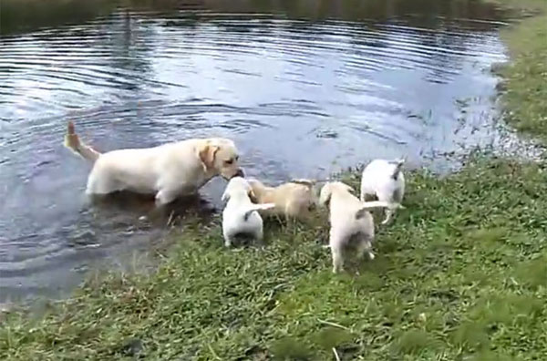 An incredibly heartwarming moment is captured on camera when a Lab daddy takes his litter of puppies down to the pond for swimming lessons. They’re all so happy!